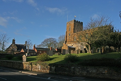 West Haddon is a village in W central Northamptonshire, 10 miles NW of Northampton on the road to Rugby (the A428). The village was a medieval market town in the Domesday hundred of Alwardsley and clusters around a crossroads on high ground in the hilly landscape, with the church at its centre and the hall site to the S. The nave is tall, with a big Perpendicular clerestorey and aisles with three-bay 13thc. arcades. There are doorways to N and S, the latter 13thc., under an 18thc. porch. The chancel has a 13thc. piscina and a small 13thc. lancet in the S wall, but the E end is Perpendicular. There is a vestry on the N side. The W tower dates from the 14thc. and had a spire which was taken down in 1648. All Saints' contains an important 12thc. font with figure scenes.